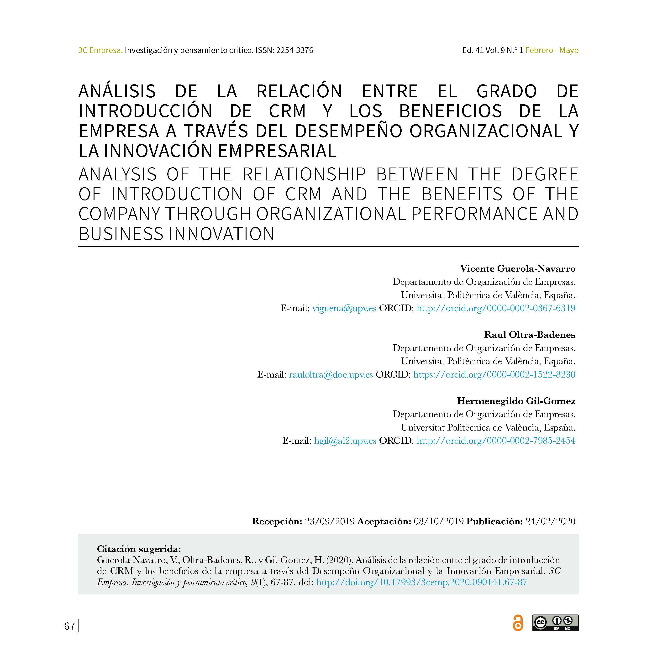 Análisis de la relación entre el grado de introducción de CRM y los beneficios de la empresa a través del Desempeño Organizacional y la Innovación Empresarial