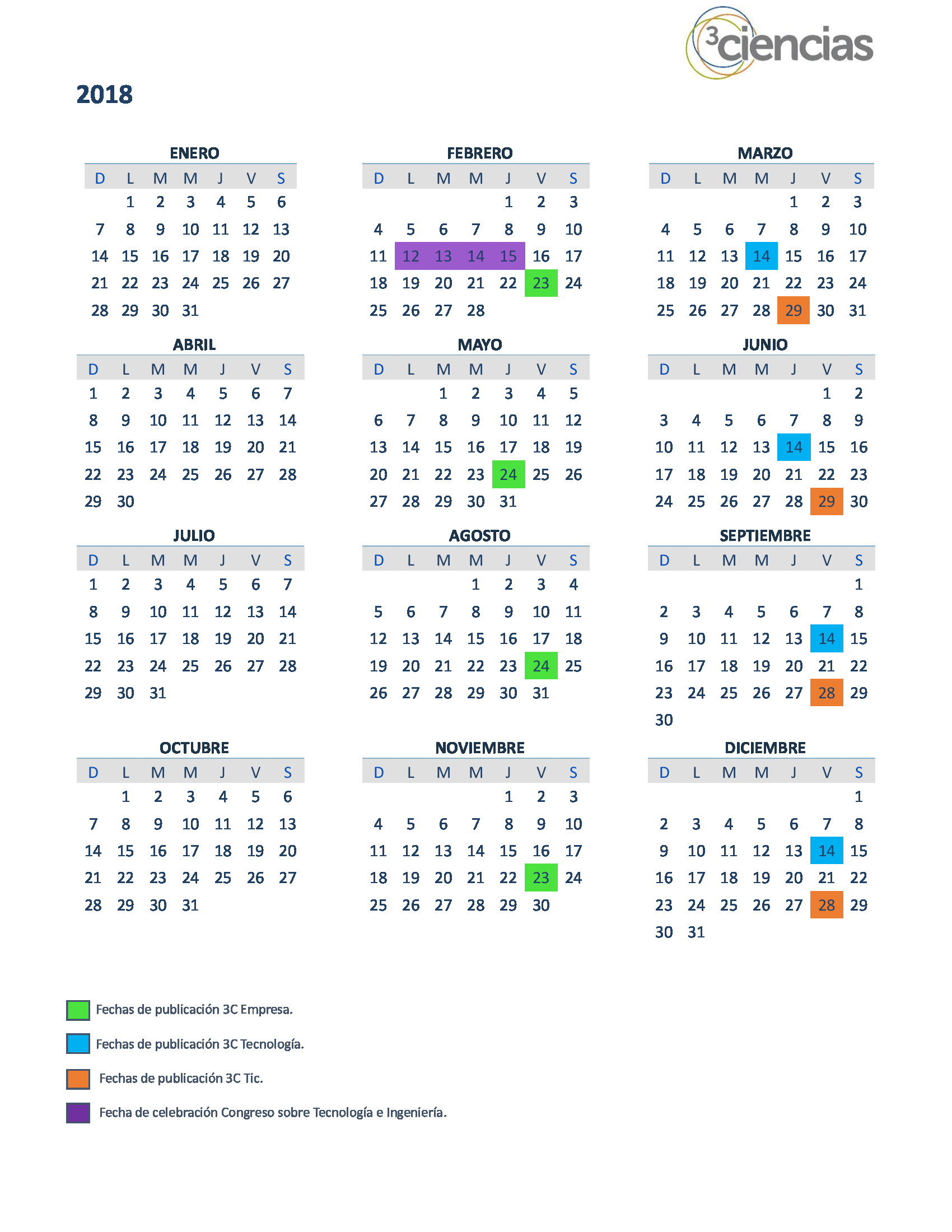 No se trata de un calendario fijo, sino que podremos ir insertando ciertas modificaciones y añadir otros eventos, pero por el momento tenéis disponible la fecha de celebración del I Congreso Internacional Online sobre Tecnología e Ingeniería, Procesos y Productos, y las fechas de publicación de las revistas: 3C Empresa, 3C TIC y 3C Tecnología.