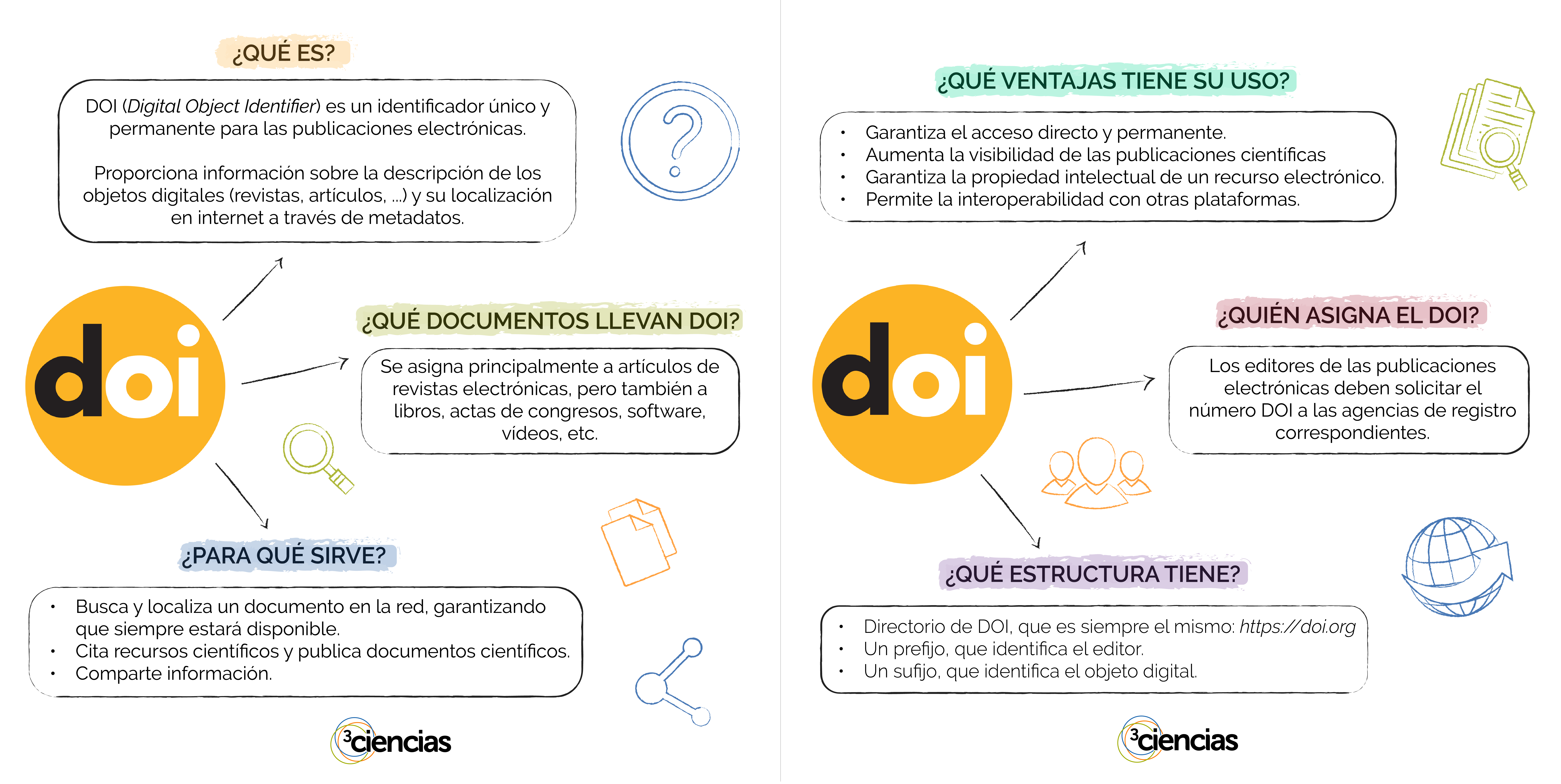 DOI (Digital Object Identifier) es un identificador único y permanente para las publicaciones electrónicas. Proporciona información sobre la descripción de los objetos digitales (revistas, artículos, …) y su localización en internet, a través de metadatos (autor, título, datos de publicación, etc.).